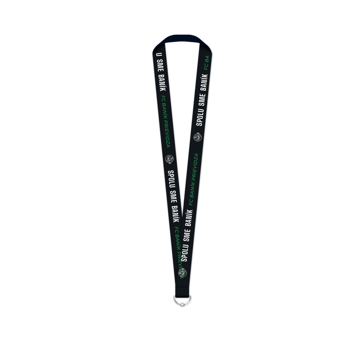 Textilná kľúčenka (šnúrka/lanyard) so zeleným popruhom a bielym nápisom "FC BANÍK PRIEVIDZA" + logo klubu. Kovová karabínka.